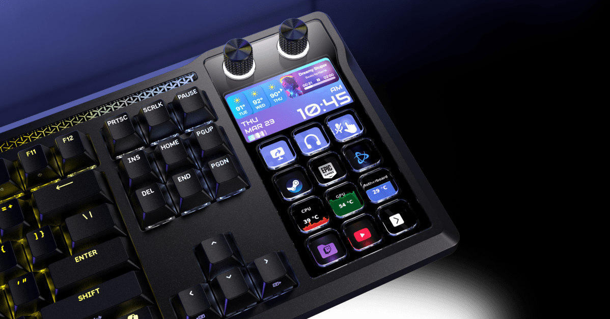 Corsair uviedol klávesnicu Galleon 100 SD, ktorá má v sebe zabudovaný Stream Deck Plus a navyše 5-palcovú obrazovku. Má kvalitné MLX Pulse switche a dva konfigurovateľné otočné gombíky.